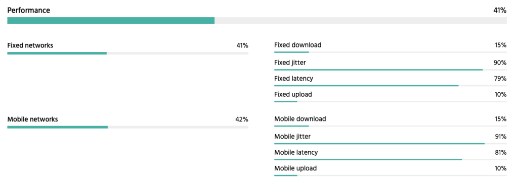 The performance pillar is the weakest of the four, where Türkiye compares unfavorably for both fixed and mobile network upload and download bandwidth performance.