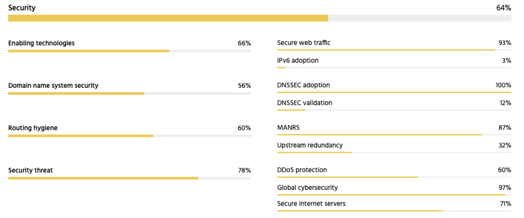 Security is also largely positive although IPv6 adoption is significantly below global trends (see more detail on this point below). The use of Domain Name System Security (DNSSEC) validation is also comparatively low.