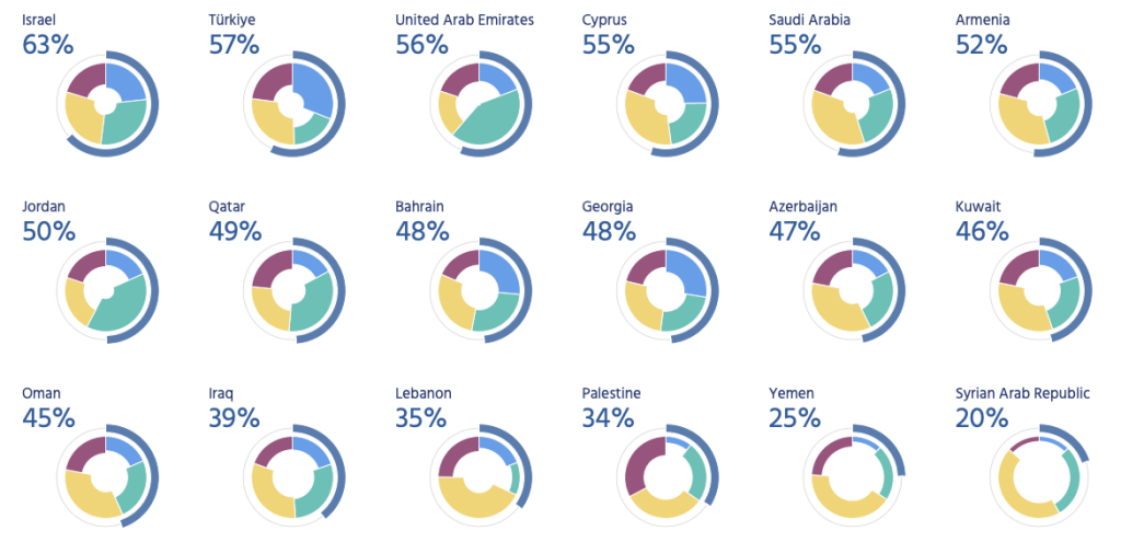 Looking at Western Asia in more detail, we can see that Türkiye (in second place just behind Israel) has one of the highest levels of overall resilience in the region, although with a noticeably lower level of Performance than some lower-ranked neighbors.
