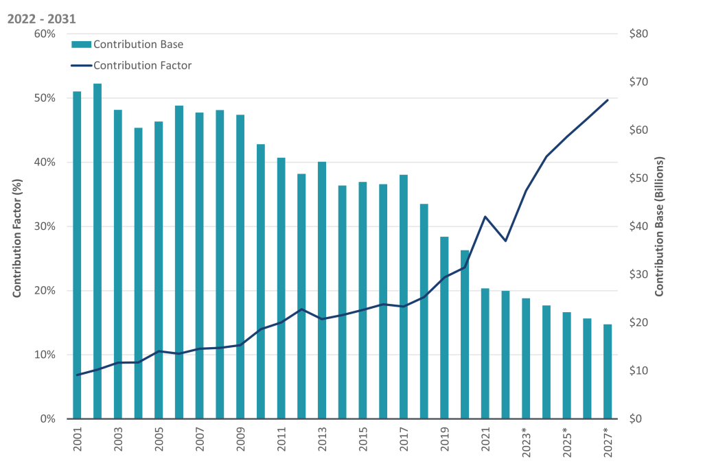 Bar and line graph showing contribution factors and disbursement totals from 2001 to 2021 with foretasted figures until 2031.