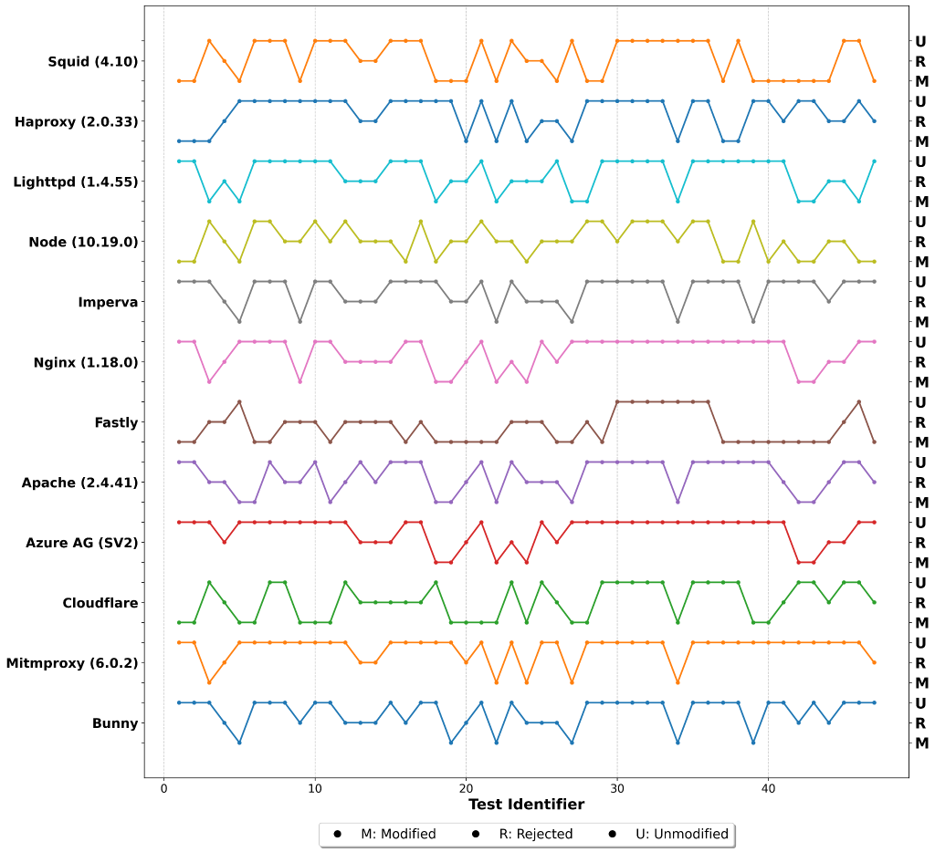 Moreover, none of the proxies followed a uniform policy for handling non-conforming data. For example, Cloudflare, a leading CDN, modified packets in 17 test cases, forwarded them unchanged in 20 cases, and rejected non-conforming packets in 10 cases.