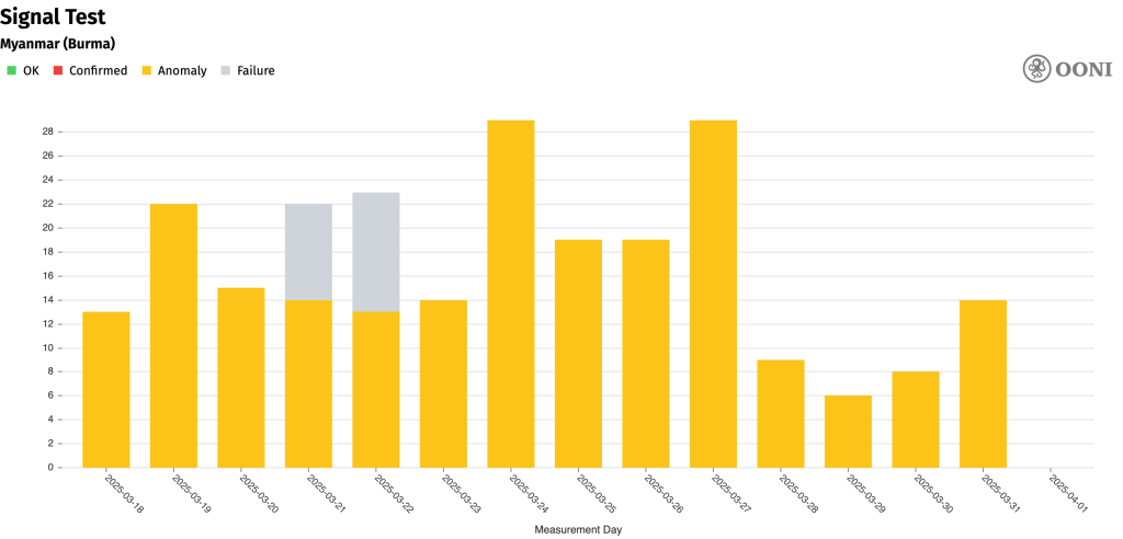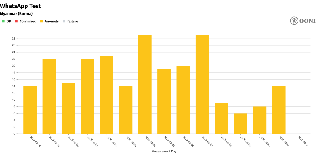 Figure 2 — Connectivity tests to Facebook Messenger, Signal, and WhatsApp from within Myanmar returned anomalies and failures before the earthquake on 28 March 2025. (Source: OONI)