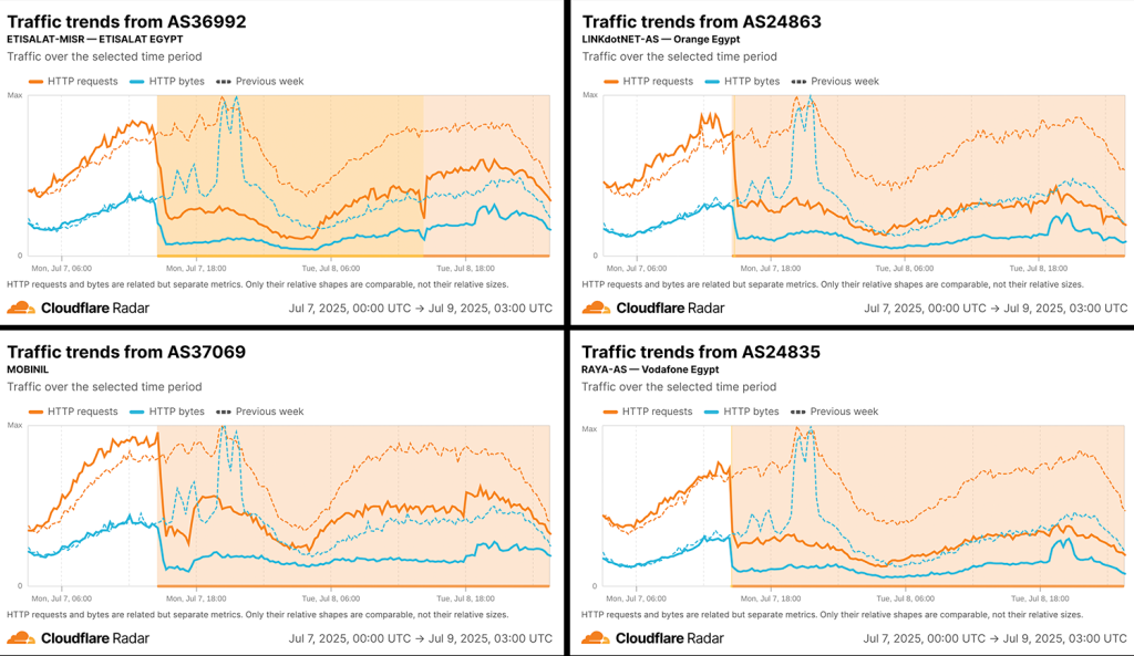 Cloudflare Radar is tracking a similar drop in overall connectivity for the country and shows the impact varies per network (Figure 2) with Etisalat (AS36992), Link.Net (AS24863, a subsidiary of Orange Telecom), Mobinil (AS37069), Raya (AS24835, a subsidiary of Vodafone Egypt) experiencing more than 80% drops in connectivity and as per writing were all recovering.