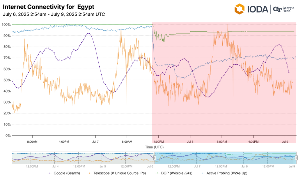 In this recent case, IODA data shows that Egypt’s Internet connectivity dropped by around 15% and has remained at 93% since 14:30 UTC.