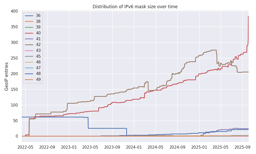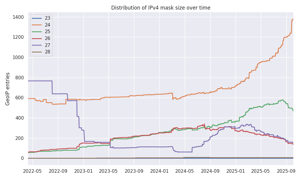 The size of the IP ranges has also evolved over the years. For IPv4, the most popular size of the IPv4 entry was once a /27, representing 32 unique IP addresses. Now, the most popular size is /24 (256 addresses), followed by /25. A /23 appeared for just one day in March 2024, when 129.222.98.0/23 was temporarily assigned to Nairobi, Kenya.