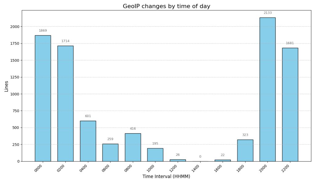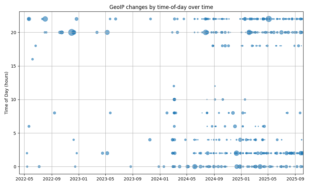 When we plot these changes by time-of-day over time (Figure 5), we can see both a general lack of activity between 06:00 and 18:00 UTC and an uptick of activity from the end of February 2024.