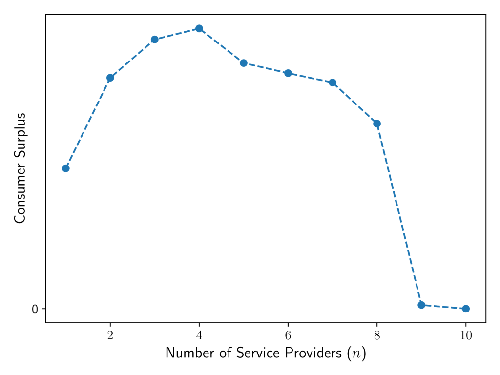 Line graph showing how as the number of mobile service providers increases, consumer surplus decreases to 0