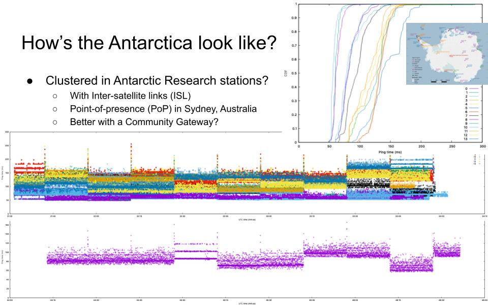 2406:2d40:4500::/42,AQ,AQ-AQ,Antarctica,Dr. Jianping Pan at the University of Victoria analyzes low-earth-orbit (LEO) satellite performance and recently published the following slide (Figure 3) on his latency measurements from the frozen continent. Visible in the graphic are the frequent changes in latency as the terminals switch from one satellite to another during an inter-satellite voyage to the Starlink ground station in Sydney, Australia.