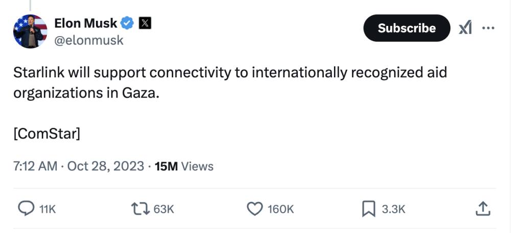 As calls mounted for help restoring connectivity during one of Gaza’s Internet blackouts, Mr Musk posted on X on 28 October that Starlink would be activated in Gaza for the first time “to support internationally recognized aid organizations in Gaza.”