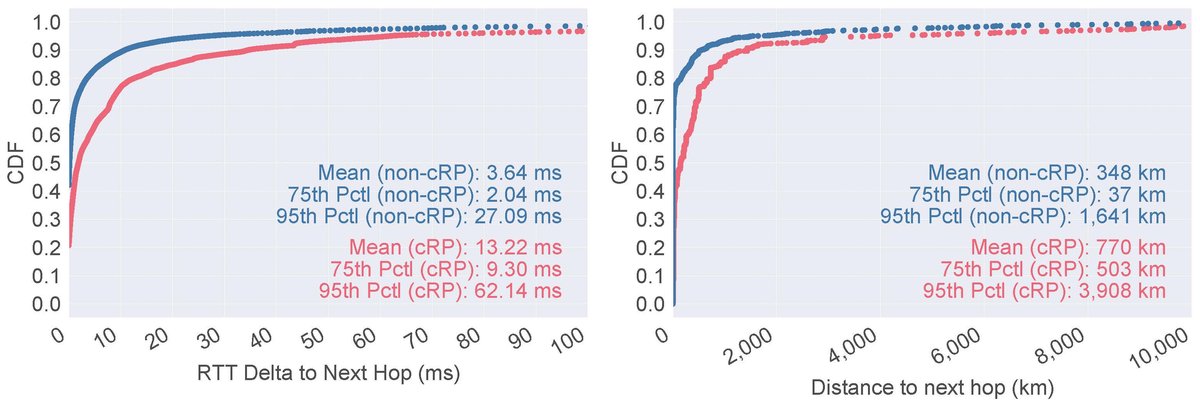 In the most extreme cases (Figure 1, left), single traceroute hops add over 60 milliseconds of delay, an eternity for latency-sensitive services like DNS resolution.