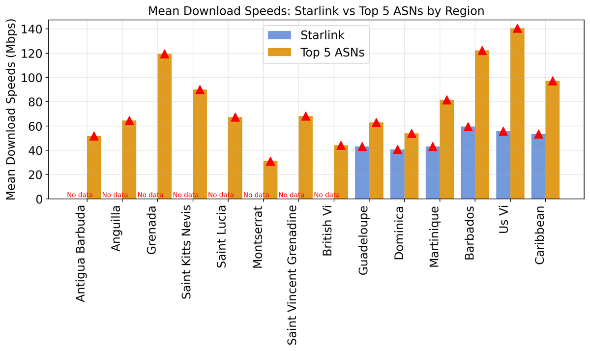 Figure 2 — Mean download speeds across the Caribbean Islands as measured by Cloudflare. Starlink speeds are lower than terrestrial ISPs. This difference is most marked in the US Virgin Islands.