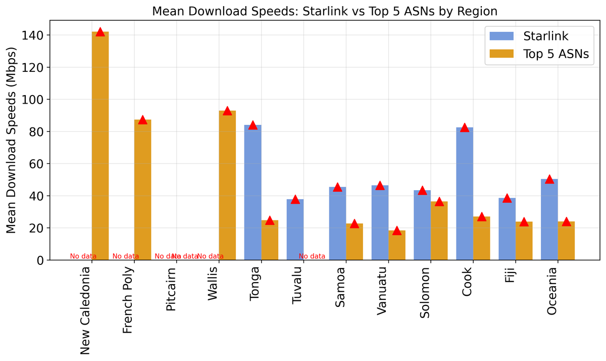Figure 1 — Mean download speeds across the Pacific Islands as measured by Cloudflare data. Starlink dominates speed across islands with a Starlink presence.