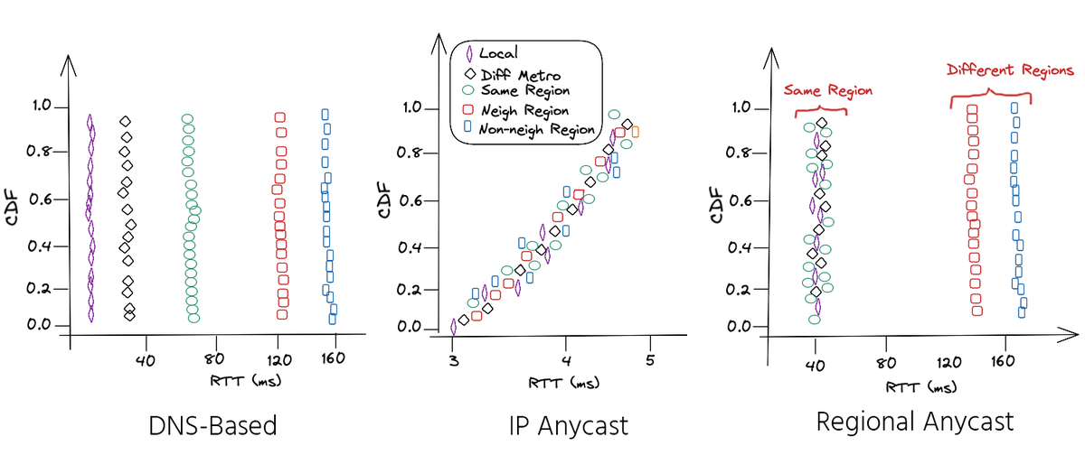 - Regional anycast falls in between: it tends to resemble IP anycast within a region, but looks more like DNS-based steering across regions.