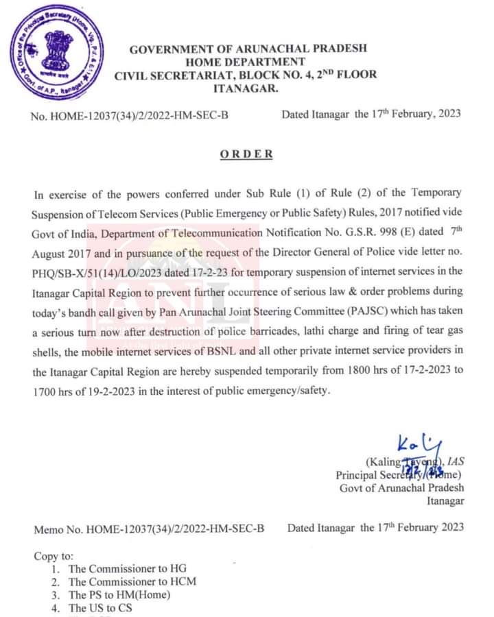 Internet services were suspended in the Itanagar Capital region on 17 February 2023. It is believed to be imposed under Section 144 of the Indian Penal Code, which allows the government to impose curfews and other restrictions in order to maintain public order. Internet shutdowns during protests or civil unrest impact the ability of citizens to get accurate information from government sources when they need it most. It also becomes harder for citizens to contact family members and friends in other parts of the country, or in other countries.