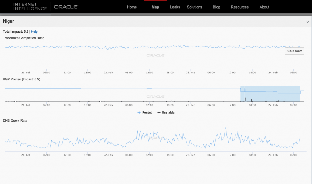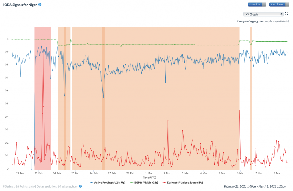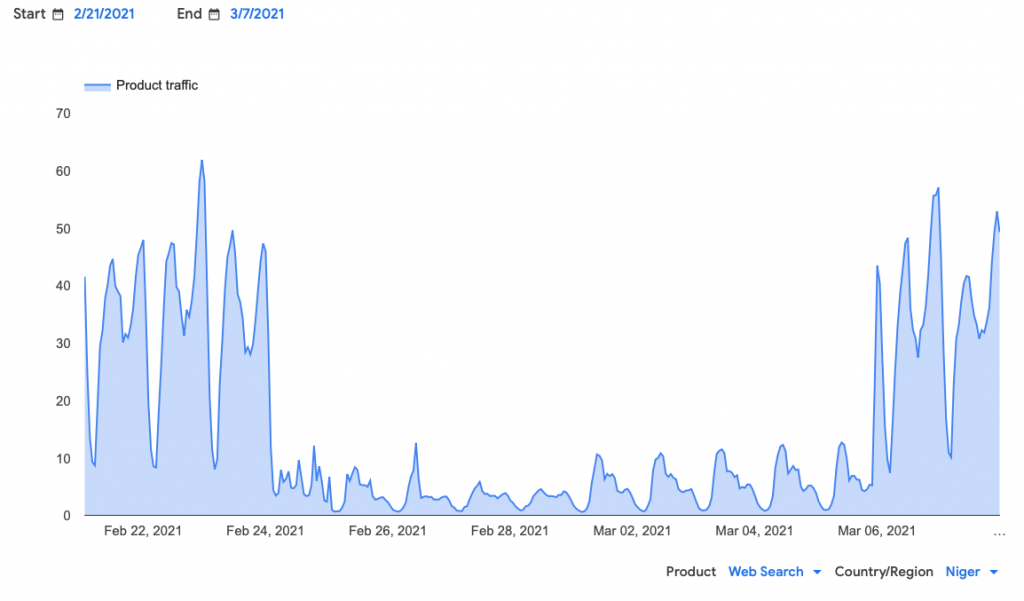 From February 24 to March 5, 2021, mobile internet was disrupted in Niger after the presidential election was followed by massive protests. As part of the government's attempts to clamp down on protests, Internet access was suspended for 10 days.