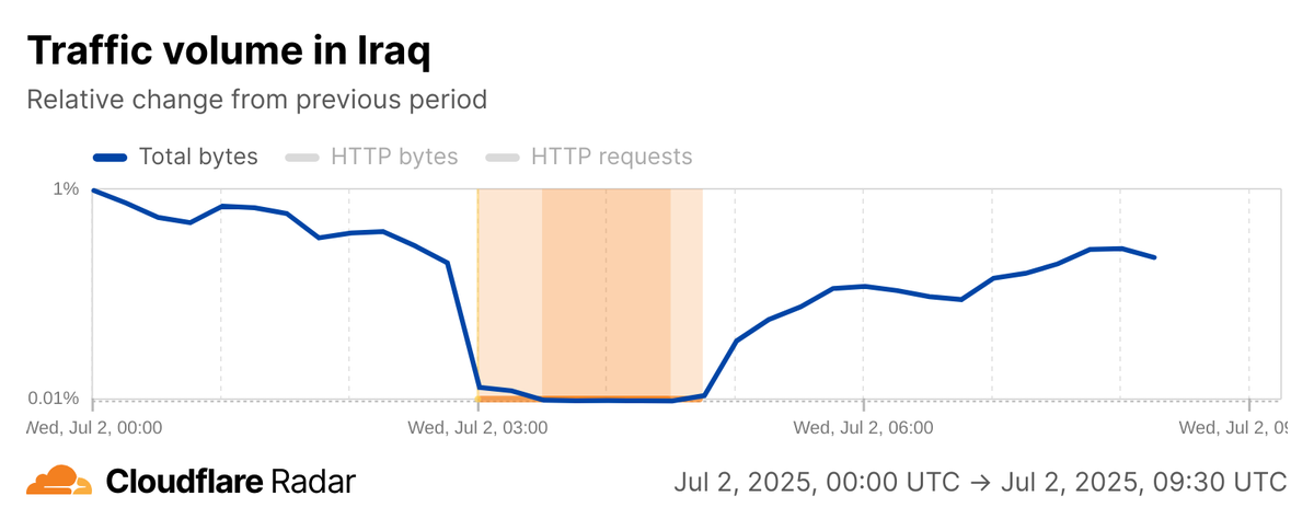 The Kurdistan Regional Government in Iraq ordered Internet services to be suspended on the morning of 2 July 2025 between 6:30 and 7:45 local time (+3 UTC). This regional shutdown coincided with larger national shutdown covering all of Iraq, both are part of series of shutdowns during the public school exams, which is expected to happen every Sunday and Wednesday. The original schedule was set to end on 29 June, however, there were no exams in the week of 15 June as the government paused exams due to Israel-Iran war.