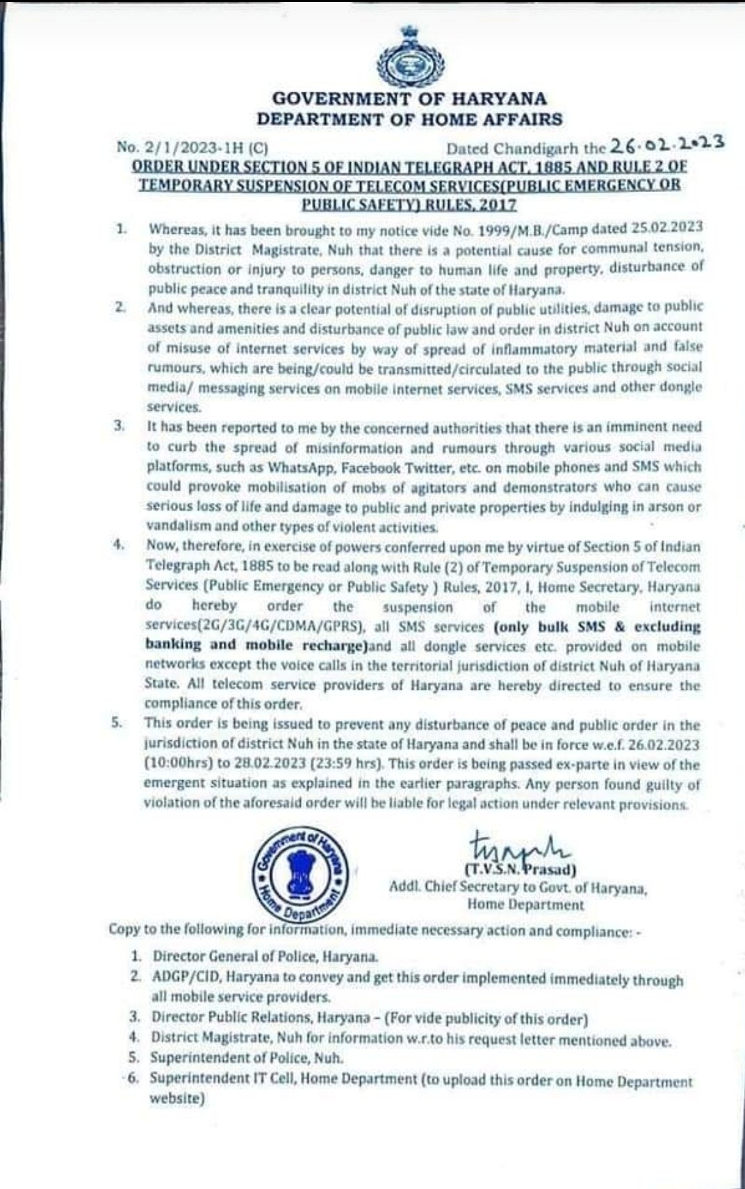 Internet services were suspended in the Nuh District on 26 February 2023.