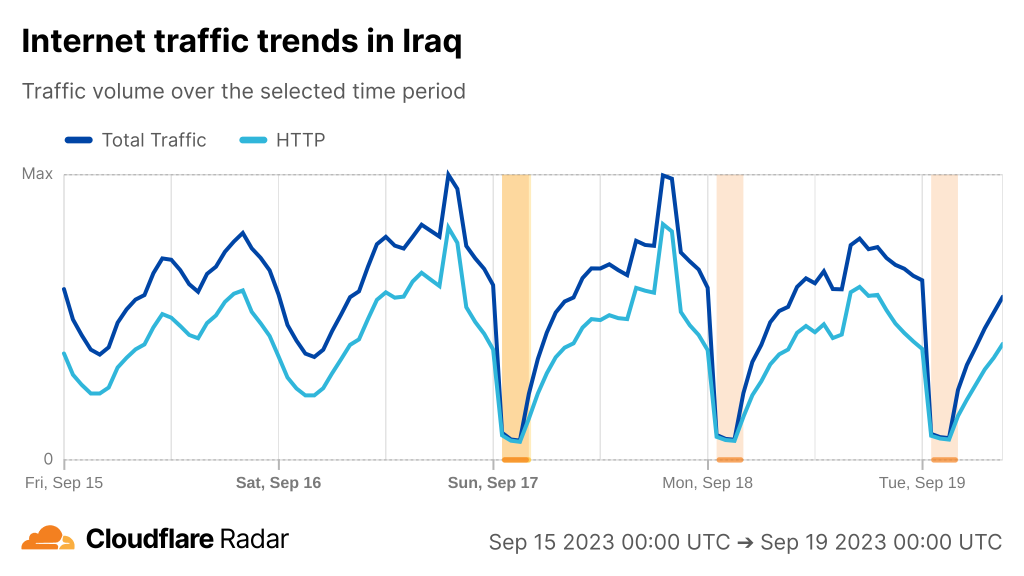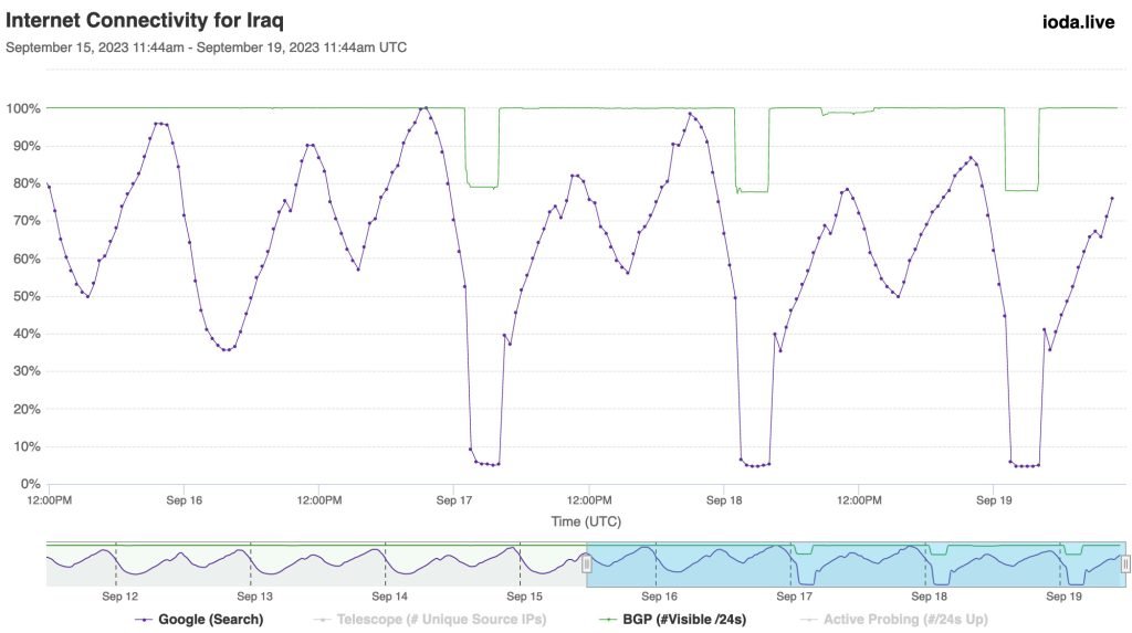 The people of Iraq have experienced the third 3-hour Internet shutdown this week on 19 September 2023 as per local authorities strategy to impose daily Internet shutdowns during second stage of middle/lower secondary school exams to reduce chetaing. The shutdowns affect everyone in Iraq, except those living in the Kurdistan region which has its own shutdowns as reported here. This is the 40th Internet shutdown in Iraq in 2023. As we have repeatedly written about here on Pulse, Internet shutdowns cause great harm to a country’s economy and society and are in our opinion NOT the appropriate mechanism to cope with potential exam cheating.