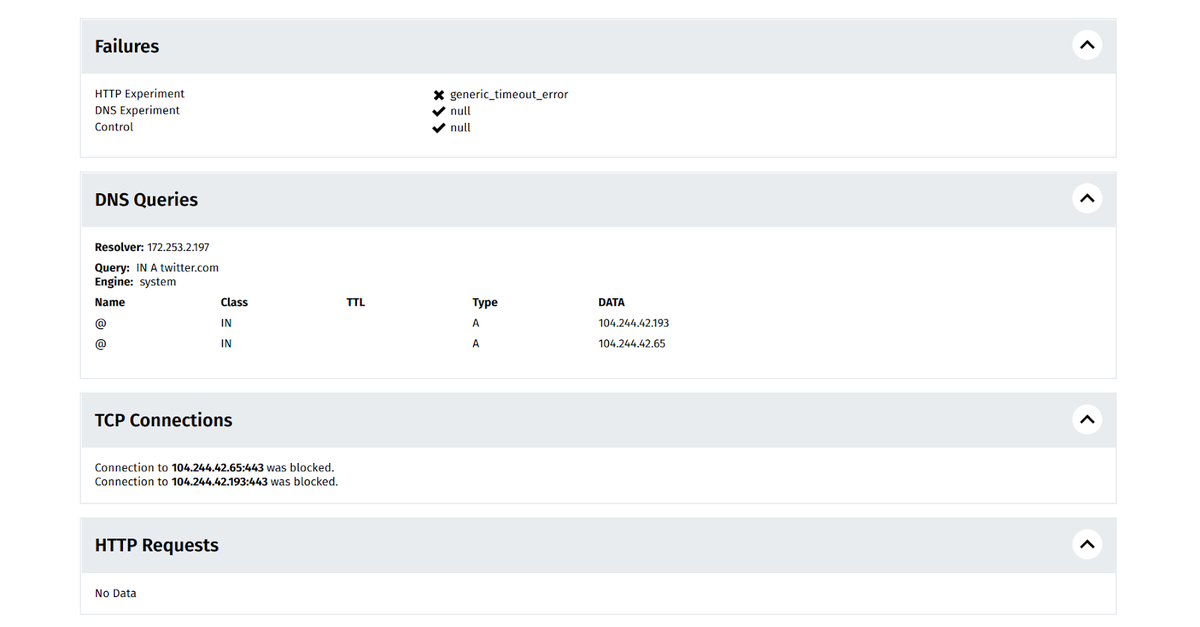 When inspecting the raw data of anomalous measurements collected from the testing of Twitter, we can see that the measurements consistently presented TCP/IP anomalies, suggesting that access to twitter.com was blocked by means of IP blocking. The relevant raw data shows that the OONI Probe experiments resulted in generic timeout errors, as attempts to connect to the resolved Twitter IPs were unsuccessful.
