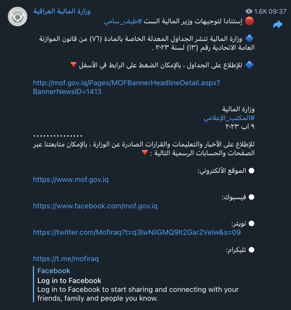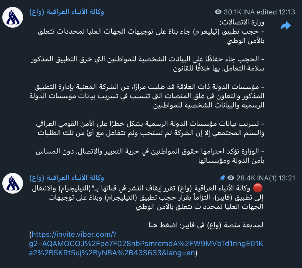 Sources on the ground informed Pulse that citizens and official channels continued to publish on Telegram after the blocking through Virtual Private Networks (VPN), which indicates that the blocking is ineffective and poses individuals to security risks of running untrustworthy VPNs. The official Iraqi News Agency published on Telegram that they are moving to Viber instead of Telegram following higher national security orders, but the Ministry of Finance kept publishing on Telegram as per the screenshots below, taken on 9 August.