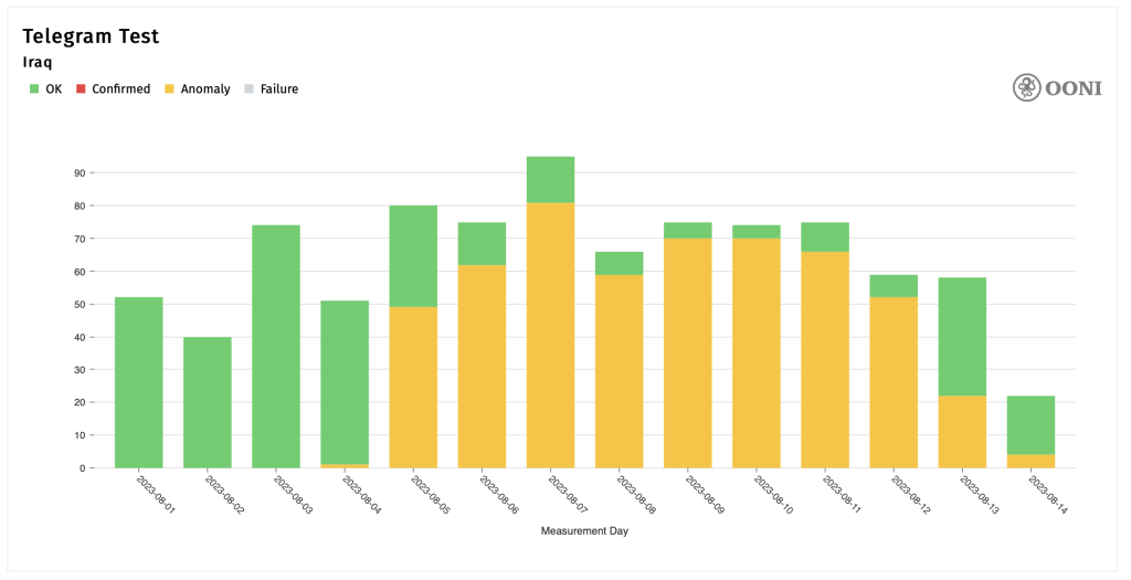 Government of Iraq banned Telegram, an instant messaging service, on Iraq networks from the 5th of August 2023. The Ministry of Telecommunication in the country issued a statement that upper authorities connected to national security mandated blocking access to the service. The blocking was measured through OONI, as seen in the chart below. The blocking is apparent on all Iraqi networks except AS206206 – Kurdistan Net Company for Computer and Internet Ltd. On August 14th, the government stated that they have reached an agreement where the company complied to the government requests, Telegram access to the service was restored as a result.