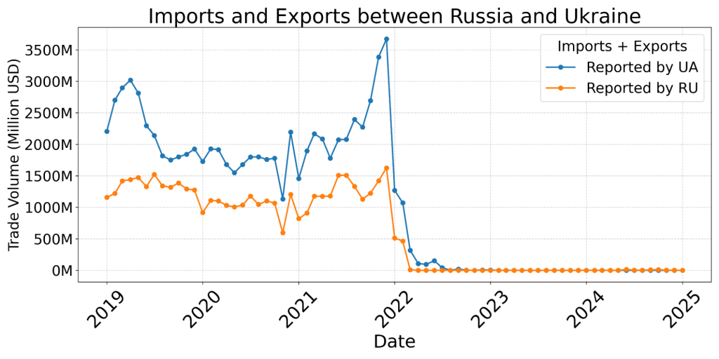 Al mismo tiempo, los volúmenes comerciales declarados entre ambos países se desplomaron, pasando de unos 1.200 millones de euros en importaciones a casi cero (Figura 2).
