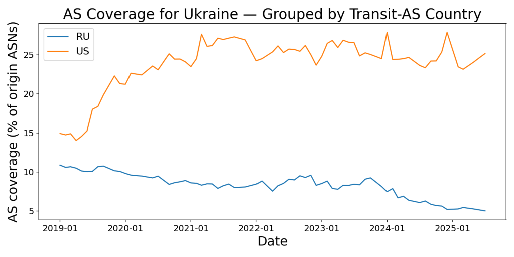 El índice de dependencia (Figura 3) muestra una variación limitada, ya que Rusia y Ucrania nunca dependieron mucho la una de la otra para el encaminamiento internacional. Sin embargo, de acuerdo con análisis independientes como