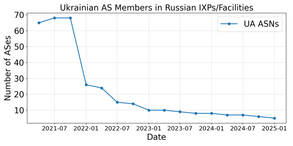 En el índice de interconexión, el número de redes ucranianas que participan en IXP e instalaciones rusas disminuyó aproximadamente un 85%, y el descenso comenzó incluso antes de la invasión (Figura 1).