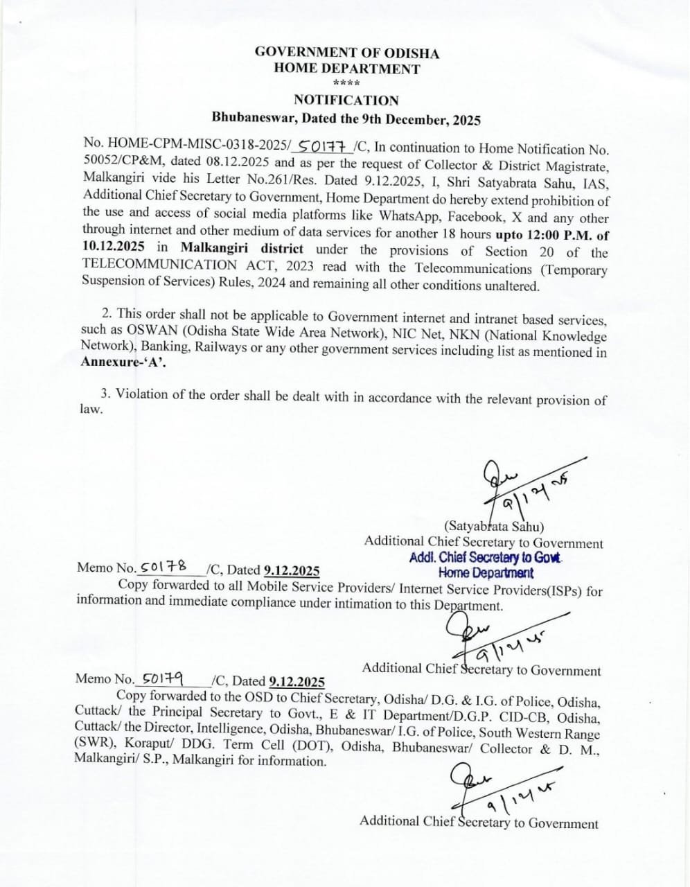 El Secretario Jefe Adicional del Gobierno, Departamento del Interior, Shri Satyabrata Sahu, emitió las órdenes en virtud de las disposiciones de la Sección 20 de la Ley de Telecomunicaciones de 2023, para impedir la difusión de mensajes incendiarios y motivados. Las órdenes originales pretenden suspender los siguientes servicios desde el 8 de diciembre de 2025, a las 18:00, hasta el 9 de diciembre de 2025, a las 18:00, hora local: