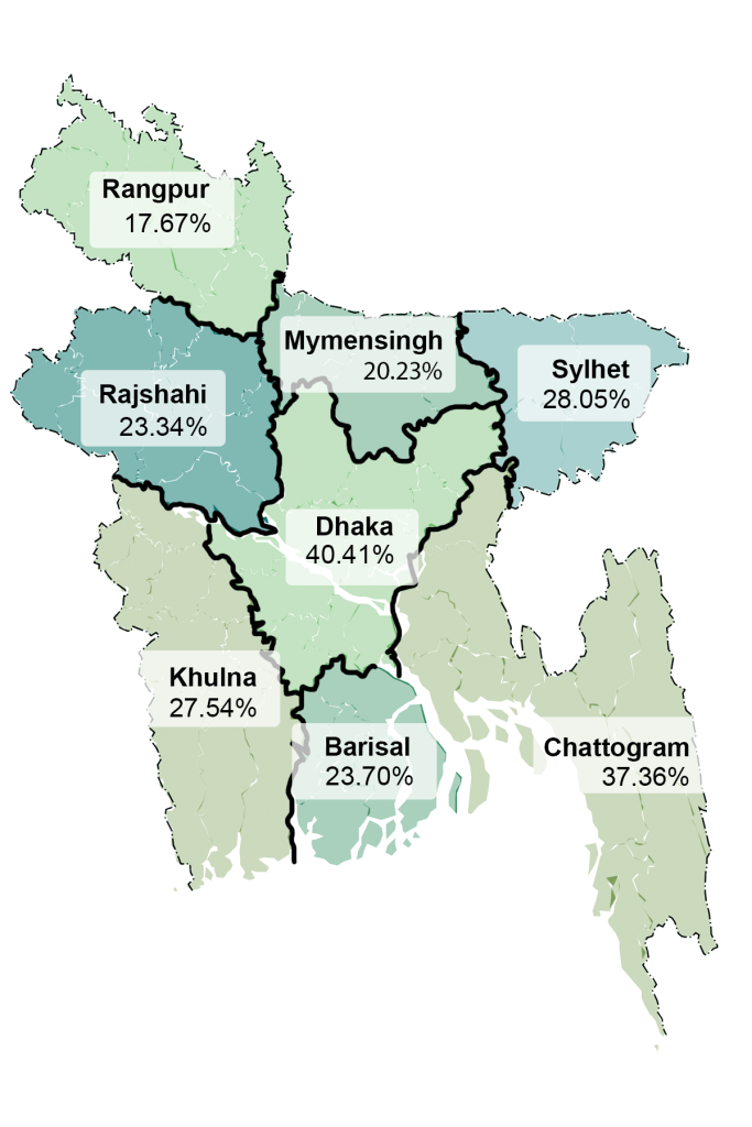 Toutefois, à l'instar de nombreuses économies en développement, cette croissance a été principalement observée dans les zones urbaines. Dhaka et Chattogram, qui disposent d'une infrastructure Internet bien établie et d'un pourcentage plus élevé de travailleurs à faible revenu, affichent les taux de pénétration Internet les plus élevés que les districts essentiellement ruraux tels que Rangpur et Rajshahi.