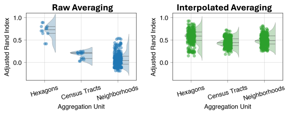 Si nous effectuons un simple calcul de moyenne sur des mesures dispersées, le choix des unités d'agrégation géographique affecte la similarité des frontières dans le temps (figure 4). Cependant, le choix de l'unité d'agrégation a moins d'impact lorsque nous calculons la moyenne des estimations de latence interpolées sur la grille - de petits hexagones pour l'agrégation entraînent une plus grande similarité des limites dans les deux cas. Un ARI médian de 0,59 pour la moyenne interpolée avec des hexagones réguliers implique une similarité modérée à solide, ce qui suggère que notre approche révèle une structure spatiale significative à travers les ajustements mensuels.