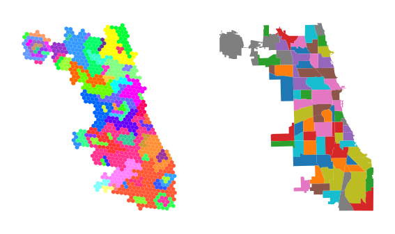 Dans le cas de Chicago, nous n'observons pas de correspondance univoque entre les limites administratives et les limites fondées sur les mesures pour le même nombre d'unités spatiales (N = 77). Ces résultats suggèrent une différence significative par rapport aux études antérieures qui utilisent les limites administratives pour agréger les données de performance Internet. Nous recommandons l'utilisation d'une interpolation préalable et d'unités spatiales à haute résolution pour les analyses orientées vers la politique.